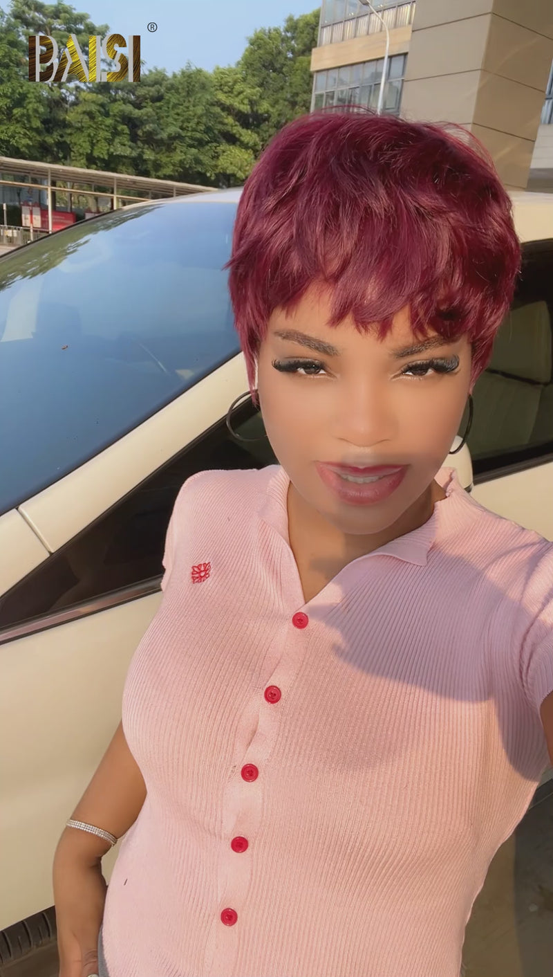 BAISI Machine Made Sexy Burgundy Color Short Cut Wig