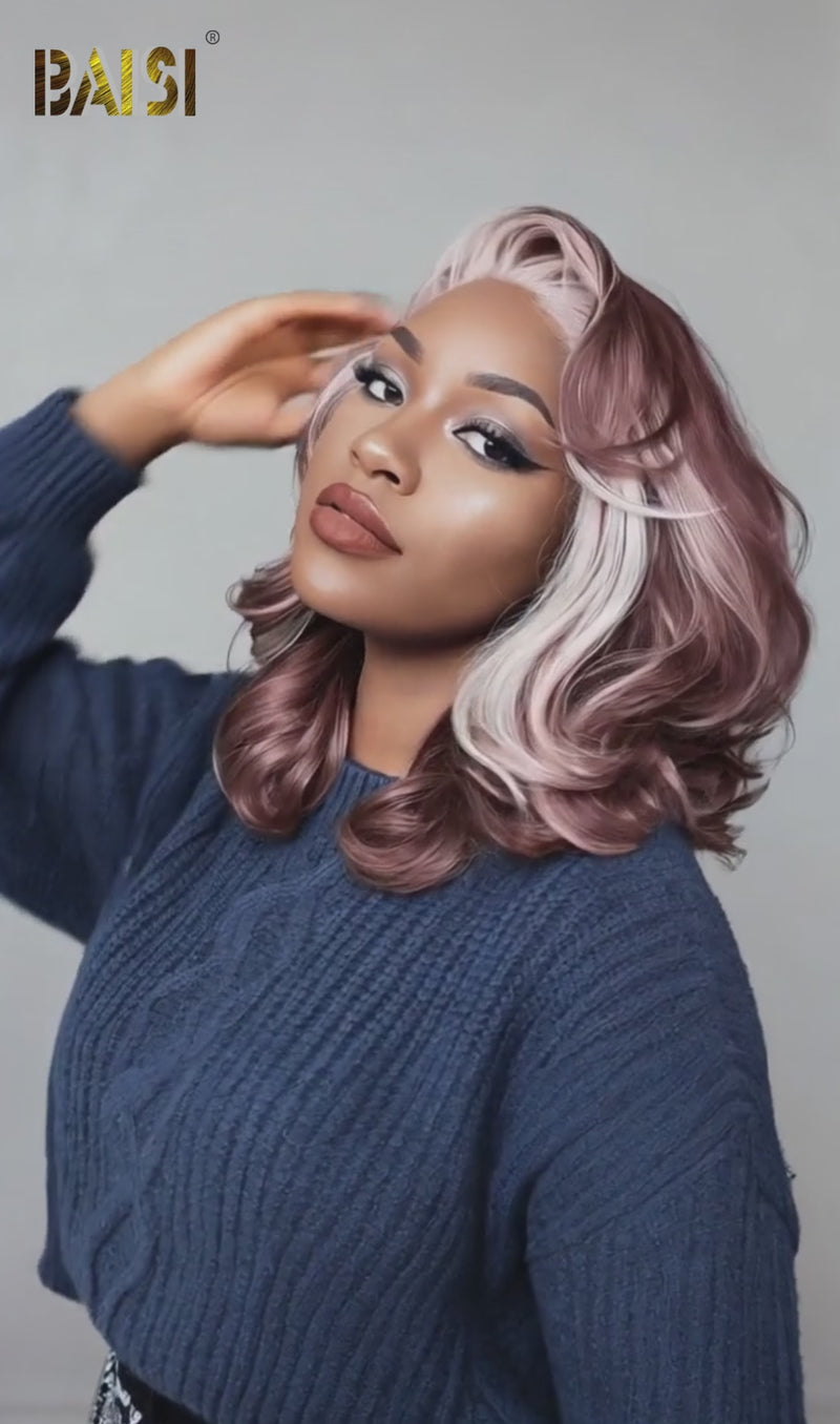 BAISI 13X4 Wine Color With Blonde Highlight Lace Wavy Wig